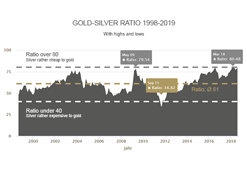 Nie tylko złoto jest walutą dobrą w kryzysie, także z pomocą srebra można budować swoje aktywa. Stosunek złota do srebra znajduje się na historycznie wysokim poziomie. O ile w ciągu ostatnich 45 lat otrzymano za uncję złota średnio 61 uncji srebra, tak teraz wskaźnik złota do srebra wynosi dobre 80. Oznacza to, że za jedną uncję złota uzyskamy więcej niż 80 uncji srebra. Gdyby ten niezwykle wysoki wskaźnik złoto-srebro ponownie osiągnął średni poziom, oznaczałoby to, że cena srebra rozwinęła się bardziej pozytywnie w stosunku do ceny złota.